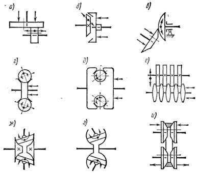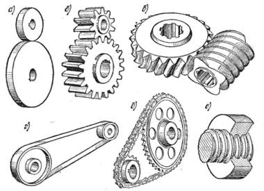 Передачі обертального руху служать для передачі енергії від двигунів до робочих машин, звичайно з перетворенням швидкостей, сил і моментів, що крутять. Крім того, ці передачі широко застосовують в різних механізмах для перетворення швидкості, а в деяких випадках і вигляду або закону руху. Передачі обертального руху підрозділяють на передачі з безпосереднім контактом тіл обертання і передачі з гнучким зв'язком, в яких тіла обертання зв'язані між собою гнучкою ланкою. До перших передач відносяться фрикційна (мал.1, а), зубчата (рис.1, б) і черв'ячна (мал.1, в), а до других - ременная (мал.1, г) і ланцюгова (мал.1, д). Залежно від способу передачі руху від ведучого тіла обертання відомому розрізняють передачі тертям і передачі тим, що зачіпляє. До перших відносяться передачі фрикційні і ремінні, а до других - зубчаті, черв'ячні і ланцюгові. До передач обертального руху відносять також передачі гвинт - гайка (мал.1, е), призначення яких - перетворювати обертальний рух в поступальний.