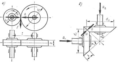 По конструкції і призначенню розрізняють фрикційні передачі декількох видів. Найпростіша фрикційна передача між паралельними валами - це циліндрова передача (мал.2, а). Найпростіша фрикційна передача між валами з пересічними осьовими лініями - коническая передача (мал.2, б). Кут між валами конічної передачі може бути будь-ким, але в більшості випадків він рівний 90°. Для правильної роботи коліс конічної передачі обидва конуси повинні мати загальну вершину.