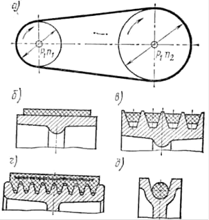 За формою поперечного перетину розрізняють плоскі (мал.5, би), клинові (мал.5, в), поліклинові (мал.5, г) до круглі (мал.5, д) приводні ремені.