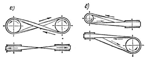 Розрізняють декілька видів плоскопасових передач. Найпоширеніша передача - відкрита (мал.5, а), здійснююча передачу між паралельними валами, що обертаються в одну сторону.
