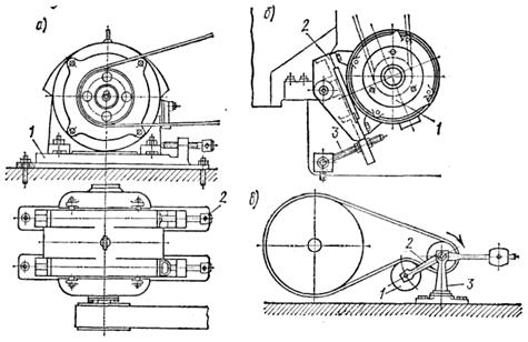Для створення тертя між шківом і ременем створюють натягнення ременів шляхом попередньої пружної деформації, переміщення одного з шківів передачі і за допомогою натяжного ролика (шківа). На мал.7, а, би показані способи натягнення ременів, здійснювані переміщенням провідного шківа, встановленого на валу електродвигуна. На мал.7, а електродвигун, встановлений на санчатах 1, переміщається разом з своїм шківом по направляючих санчат за допомогою віджимних гвинтів 2. На мал.7, би положення електродвигуна 1, встановленого на плиті, що гойдається, 2, фіксується настановним гвинтом 3. Схема ремінної передачі з натяжним роликом показана на мал.7, в; натяжний ролик 1 обертається на осі, закріпленій у важелі 2, вільно що гойдається навкруги осі, закріпленої в стійці 3. Натиснення ролика на ремінь здійснюється або за допомогою вантажу, як показано на малюнку, або за допомогою пружини. Користуються також натяжними роликами, осі яких після регулювання затягування ременя закріплюють нерухомо. Ці ролики простіше, та зате ролики з рухомими осями автоматично забезпечують необхідне натягнення ременя. Натяжні ролики застосовують в плоскопасових і порівняно рідкісно в клинопасових передачах при малій міжосьовій відстані і великих передавальних відносинах в цілях збільшення кута обхвату ременем меншого шківа.