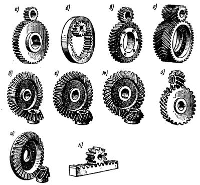 Найпростіша зубчата передача складається з двох коліс із зубами, за допомогою яких вони зчіплюються між собою (мал.8, а... і). Обертання провідного зубчатого колеса перетвориться в обертання відомого колеса шляхом натиснення зубів першого на зуби другого. Менше зубчате колесо передачі називається шестернею, більше - колесом.