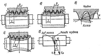 Залежно від форми профілю різьблення циліндрових черв'яків розрізняють черв'яки: архімедові, конволютні, евольвентні і з увігнутим профілем витків. Архімеда черв'як (мал.12, а) в осьовому перетині має трапецеїдальний профіль різьблення. В перетині торця витки різьблення обкреслені архімедовою спіраллю, звідки цей черв'як і одержав свою назву. Конволютний черв'як має трапецеїдальний профіль різьблення в нормальному перетині витків. Евольвентний черв'як (мал.12, б) характеризується евольвентним профілем різьблення в перетині. В машинобудуванні найбільш поширені архімедові черв'яки, оскільки технологія виробництва їх проста і добре розроблена. Архимедови черв'яки застосовують звичайно без шліфовки. При необхідності шліфовки робочих поверхонь витків різьблення вибирають конволютні і евольвентні черв'яки, шліфовка яких в порівнянні з архімедовим черв'яком простіше і дешевше. Черв'яки з увігнутим профілем витків різьблення (мал.12, в) мають велику поверхню контакту із зубами черв'ячних коліс, і тому, мабуть, в майбутньому вони знайдуть широке вживання. В передачах з архімедовими, конволютними і евольвентними черв'яками профіль зубів черв'ячних коліс евольвентний (мал.12, а, б). Отже, в перетині, що проходить через вісь черв'яка і середню площину колеса, той, що зачіпляє черв'ячної передачі, є тим, що евольвентне зачіпляення зубчатого колеса із зубчатою рейкою (мал.12, а, б). Той, що це зачіпляє, може бути без зсуву або із зсувом. Найбільш поширені черв'ячні передачі без зсуву. Черв'ячні передачі із зсувом застосовують при необхідності вписания в задану або стандартну міжосьову відстань.