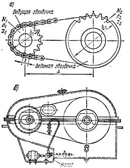 Ланцюгова передача в найпоширенішому вигляді складається з розташованих на деякій відстані один від одного двох коліс, званих зірочками, і охоплюючого їх ланцюга (мал.13, а). Обертання ведучої зірочки перетвориться в обертання відомого завдяки зчепленню ланцюга із зубами зірочок. Іноді застосовують ланцюгові передачі з декількома відомими зірочками. Ланцюгові передачі, що працюють при великих навантаженнях і швидкостях, поміщають в спеціальні кожухи, звані картерами (мал.13, б), що забезпечує постійне рясне мастило ланцюга, безпеку і захист передачі від забруднень і зменшення шуму, що виникає при її роботі. Іноді застосовують ланцюгові варіатори, влаштовані по схемі колодка-ремінних варіаторів з розсувними конусами.