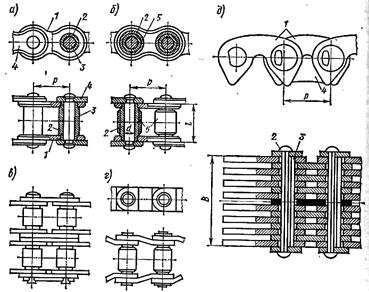 Приводні роликові ланцюги по ГОСТ 13568-75 розрізняють однорядні нормальні (ПР), однорядні довголанцюгові полегшені (ПРД), однорядні посилені (ПРУ), двох (2ПР) - , трьох (ЗПР) - і чотирирядні (4ПР) і із зігнутими пластинками (ПРИ). Роликовий однорядний ланцюг (мал.14, би) відрізняється від втулкової тим, що на її втулках 2 встановлюють ролики 5, що вільно обертаються. Ролики замінюють тертя ковзання між втулками і зубами зірочок у втулковому ланцюзі тертям кочення. Тому зносостійкість роликових ланцюгів в порівнянні з втулковими значно вище і відповідно їх застосовують при окружних швидкостях передач до 20 м/с. З роликових однорядних ланцюгів найбільш поширені нормальні ін. Довголанцюгові полегшені ланцюги прд виготовляють із зниженим руйнуючим навантаженням; швидкість, що допускається, для них до 3 м/с. Посилені ланцюги прд виготовляють підвищеній міцності і точностіланцюги (мал.14, в)багаторядності дозволяють збільшувати навантаження пропорційно числу рядів, тому їх застосовують при передачі великих потужностей. Роликові ланцюги із зігнутими пластинами (мал.14, г) підвищеній податливості застосовують при динамічних навантаженнях (ударах, частих реверсах і т.д.)