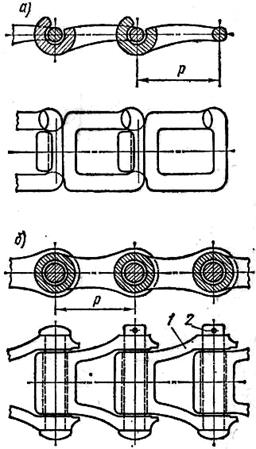 Втулковий однорядний ланцюг (мал.14, а) складається з внутрішніх пластин 1, напресованих на втулки 2, вільно що обертаються на валах 3, на яких напресовані зовнішні пластини 4. Залежно від передаваної потужності приводні втулкові ланцюги виготовляють однорядними (ПВ) і дворядними (2ПВ). Ці ланцюги прості по конструкції, мають невелику масу і найдешевші, але менш зносостійкі, тому вживання їх обмежують невеликими швидкостями, звичайно до 10 м/с.