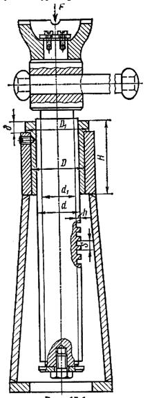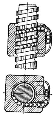Передачу гвинт - гайка виконують: з гвинтом і поступальним рухом гайки (найпоширеніший вид передачі), що обертається, - з гвинтом, що обертається і одночасно поступально переміщуваним при нерухомій гайці (простий домкрат, мал.16); з гайкою і поступальним рухом гвинта, що обертається. Зустрічаються передачі інших конструкцій, у тому числі і телескопічна з двома гвинтовими парами. Застосовують передачі гвинт - гайка, в яких тертя ковзання замінено тертям кочення, - кулькові гвинтові пари (мал.17). Така передача складається з гвинта, гайки і кульок, що заповнюють простір між западинами різьблення. Переміщення кульок відбувається по замкнутому каналу, що сполучає перший і останній витки різьблення гайки. Різноманітні конструкції кулькових гвинтових пар відрізняються профілем різьблення і розташовує каналу для кульок.