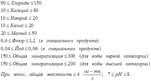 Для питьевой воды высшей категории качества недопустимо содержание болезнетворных бактерий и вирусов любой природы в любой определяемой известными методами концентрации. Основное отличие бутилированная вода высшей категории от других аналогичных продуктов, - это единственный вид питьевой воды, к которому, кроме требований отсутствия вредности для организма, предъявляются требования физиологической полезности, т.е. нормирование содержания целого ряда химических элементов: растворенного кислорода, натрия, калия, хлоридов, кальция, фтора. При выпуске бутилированной воды с соединениями йода, что актуально для большинства регионов РФ, как имеющих дефицит йода в питании населения, нормируются его содержание и устойчивость соответствующих соединений. Причем достаточно жестко нормируется именно диапазон концентраций указанных элементов. Характерным отличием бутилированной воды высшего качества (во всех странах) является также то, что источником сырья для неё могут являться лишь достаточно глубокие (гарантированно защищенные от влияния поверхностных вод) артезианские скважины. Это связано с тем, что только 1% поверхностных водных источников отвечает требованиям, на которые рассчитаны традиционные технологии водоподготовки. [3]