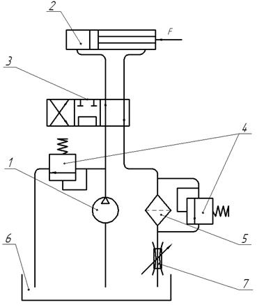 Рисунок 1.1-Насос; 2-Гидроцилиндр; 3-Гидрораспределитель; 4-Переливной клапан; 5-Фильтр; 6-Бак; 7-Дроссель;