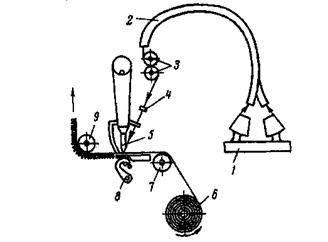 Заправка нити в трубку производится пневматическим устройством с помощью специального сопла. Концы нитей при обрыве не связывают, а склеивают путем нанесения тонкого слоя клея специальным приспособлением на конец нити. Затем нить заправляется в эмалированные глазки нитенаправителей 4 и в отверстие иглы 5. Каркасный материал 6 огибает игольчатый валик 7, при помощи которого подается в зону прошива. После прошива, который осуществляется с помощью иглы и петлеобразователя 8, образованное нетканое полотно выводится игольчатым валиком 9 из зоны прошива.