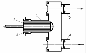 Рис. 3 - 17. Схема безсальникового насоса: 1 – корпус; 2 – робоче колесо: 3 – додаткове колесо; 4 – пружина; 5 – конічна втулка. |