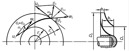 де – товщина лопатей; z – число лопатей; b 1 і b 2 – ширина робочого колеса на внутрішньому і зовнішньому колах відповідно; C 1r і C 2r – радіальні складові абсолютних швидкостей на вході в колесо й виході з нього, причому (C 1r = C 1 ).
