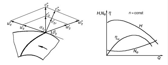 Рівняння (3.23) показує, що напір насоса пропорційний квадрату числа обертів робочого колеса (тому що u 2 = D 2 n )і залежить від форми лопатей.