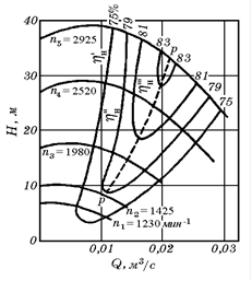 Знімаючи характеристики насоса при різних числах обертів робочого колеса (n 1 , n 2 , n 3 ,.....), одержують ряд залежностей H - Q (рис. 3.13). На кожній кривій H - Q виділяють точки, що відповідають деякому постійному значенню к. к. д. (Н ', Н ", Н ''', . . . ), які з’єднують між собою плавною лінією. Ці лінії обмежують області, усередині яких к.к.д. насоса має значення не менше, ніж зазначене на границі області. Лінія p - p відповідає максимальним значенням к. к. д. при даних числах обертів робочого колеса. Отримані таким шляхом графічні залежності між напором, к. к. д. і продуктивністю насоса при різних числах обертів колеса називають універсальними характеристиками . Користуючись універсальною характеристикою, можна встановити межі роботи насоса (відповідні максимальному значенню к.к.д.) і вибрати найбільш сприятливий режим його роботи.