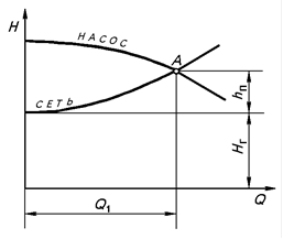 Об’єднання характеристик мережі й насоса показане на рис. 3 -14. Точка A перетину цих характеристик називається робочою точкою ; вона відповідає найбільшій продуктивності насоса Q 1 при його роботі на дану мережу. Якщо потрібна більш висока продуктивність, то необхідно або збільшити число обертів електродвигуна, або замінити даний насос на насос більшої продуктивності. Збільшення продуктивності може бути досягнуте також шляхом зменшення гідравлічного опору мережі h В . У цьому випадку робоча точка переміститься по характеристиці насоса вправо.