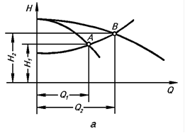 При послідовному з’єднанні насосів загальну характеристику одержують додаванням напорів насосів для кожного значення продуктивності. На рис. 3-14б представлена загальна характеристика двох однакових насосів, з’єднаних послідовно. Точка перетину цієї характеристики з характеристикою мережі (робоча точка В ) відповідає сумарним напору й продуктивності (H 2 і Q 2 ) послідовно з’єднаних насосів, що працюють на дану мережу. При такому з’єднанні насосів вдається значно збільшити напір, якщо характеристика мережі є досить крутою.