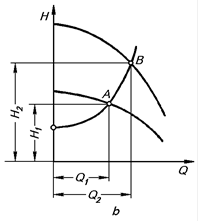 При паралельному з’єднанні характеристику насосів одержують додаванням абсцис характеристик кожного з насосів для даного напору На рис. 3-15апоказана характеристика двох однакових насосів, що працюють паралельно. Об’єднання характеристики мережі із загальною характеристикою насосів показує, що робоча точка В у цьому випадку відповідає продуктивності Q 2 більшій, ніж продуктивність одного насоса Q 1 (точка А ). Однак загальна продуктивність завжди буде менше суми продуктивностей насосів, що працюють окремо один від іншого, що пов’язане з параболічною формою характеристики мережі. Чим крутіше ця характеристика, тим менше збільшення продуктивності. Тому паралельне включення насосів використовують для збільшення продуктивності насосної установки, коли характеристика мережі є досить пологою. Збільшення напору при цьому незначне.