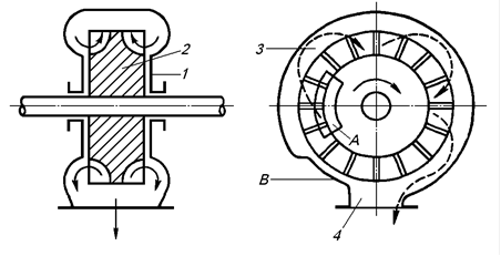 А – вхідне вікно; В – ущільнююча ділянка; 1 – корпус; 2 – робоче колесо; 3 – кільцевий канал; 4 – нагнітальний патрубок.