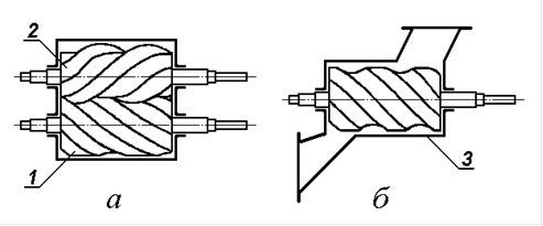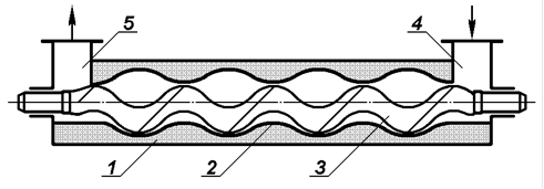 Одногвинтові (героторні) насоси (екструдери). У циліндричний корпус насоса 1 (рис. 3-21) із внутрішньою профільованою гвинтовою поверхнею 2 , що зветься обоймою, встановлюється однозахідний гвинт 3 . Між обоймою й гвинтом утворюються замкнуті порожнини 4 , заповнені при роботі насоса рідиною; при обертанні гвинта вони переміщуються уздовж осі насоса.