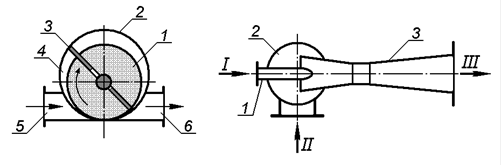 Рис. 3 -22. Схема пластинчастого ротаційного насоса: 1 – ротор; 2 – корпус; 3 – пластини; 4 – робочий простір; 5 – всмоктувальний патрубок; 6 – нагнітальний патрубок. |