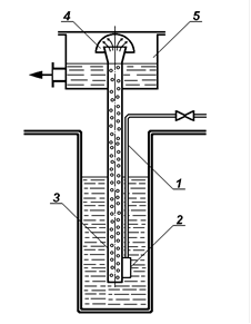 Рис. 3 - 25. Повітряний підйомник: 1 – труба для подачі стисненого повітря; 2 – змішувач; 3 – піднімальна труба; 4 – відбійник; 5 – збірник. |