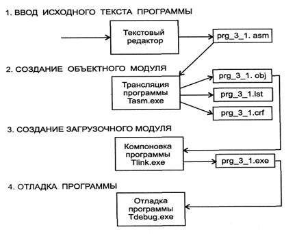 На малюнку 1.1 наведена загальна схема процесу розробки програми на асемблері. На схемі виділено чотири кроки процесу. На першому кроці, коли вводиться код програми, можна використовувати будь-який текстовий редактор. Основною вимогою до нього є те, щоб він не вставляв сторонніх символів. Файл повинен мати розширення asm.