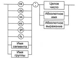 Оператор перевизначення сегмента: (двокрапка) змушує обчислювати фізичну адресу щодо конкретно задається сегментної складової: «ім'я сегментного регістра», «ім'я сегмента» з відповідної директиви SEGMENT або «ім'я групи».