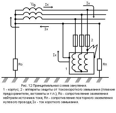 Зануление - преднамеренное электрическое соединение с нулевым защитным проводником металлических нетоковедущих частей, которые могут оказаться под напряжением (рис.12).