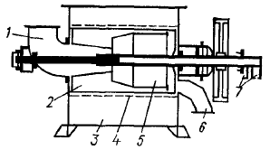 Диффузор непрерывного действия (рис. 2) представляет собой воронку, насаженную на верхнюю часть бака для щелока. В конус воронки снизу подается насосом масса со щелоком из выдувного резервуара с концентрацией 10—12%. Если диффузор используется для домывки массы после котла типа Камюр, имеющего зону горячей промывки, то полупромытая масса непосредственно переходит из котла в диффузор по передувной трубе. Внутри диффузора масса со щелоком при неизменной концентрации движется снизу вверх; скорость движения в верхней, цилиндрической, части диффузора составляет 80-100 мм/мин. В верхней части цилиндрического корпуса (1) подвешен пакет двусторонних концентрических промывных сит (2) с отверстиями диаметром около 2 мм. Число кольцевых сит в диффузорах различных размеров составляет от двух до пяти.