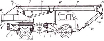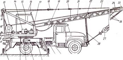 Ходовое устройство — шасси грузового автомобиля. В связи с необходимостью размещения на нем механизмов и узлов крановой установки в конструкцию шасси вносят ряд изменений: вместо кузова на раме автомобиля закрепляют ходовую раму, дополнительно устанавливают коробку отбора мощности 2, опорную стойку 28 стрелы, а также стабилизаторы 6 или выключатели упругих подвесок. У кранов с механическим приводом дополнительно устанавливают промежуточный редуктор 5, у кранов с гидравлическим приводом — масляный бак. При необходимости изменяют место расположения топливных баков и запасных колес.