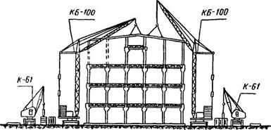 Число ведущих машин определяют из расчета своевременного выполнения полного объема работ в соответствии с графиком их производства. При этом за основу расчета принимаются эксплуатационная производительность машин и рациональные режимы их эксплуатации с учетом возможных простоев по технологическим, техническим и метеорологическим причинам. Число вспомогательных машин в комплекте определяют отдельно по каждому виду вспомогательных работ. Например, монтаж наземных конструкций корпуса промышленного предприятия может быть осуществлен следующими двумя комплектами машин. По первому варианту (рис. 2, а) монтаж конструкций осуществляется четырьмя башенными кранами марки КБ-100, для чего здание в плане разделено на четыре равновеликих участка.
