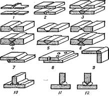 Для изготовления сварных конструкций применяют следующие основные типы соединений: стыковое, внахлестку, заклепочное, угловое и тавровое. Стыковые соединения с отбортовкой (рис. 1, 1) применяют при толщине листа до 3 мм, листы толщиной 3 - 8 мм сваривают без разделки кромок (рис. 1, 2), при толщине листов до 15 мм применяют V-образную разделку кромок (рис. 1, 3), при толщине более 15 мм – X-образную разделку (рис. 1, 4), при толщине свыше 20 мм – чашеобразную простую или двустороннюю разделку (рис. 1, 5, 6). При соединении внахлестку (рис. 1, 7) величина перекрытия кромок равна 3-5-кратной толщине свариваемых частей. Электрозаклепками (рис. 1, 8) обеспечивается получение прочных (но не плотных) соединений; для сварки верхний лист просверливается (или пробивается) и при заварке отверстия приваривается и нижний лист; тонкие (до 3 мм) листы проплавляют дугой по-целому, без отверстий. Угловые соединения (рис. 1, 9) чаще всего получают без специальной разделки кромок. Тавровые соединения для конструкций, несущих небольшие нагрузки, выполняют без скоса кромок (рис. 1, 10); при больших нагрузках для элементов толщиной 10 - 20 мм применяют односторонний (рис. 1, 11), а при толщине более 20 мм – двусторонний скос (рис. 1, 12).