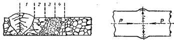 Структура сварных швов термического класса зависит от вида сварки и ее технологии. При значительной массе проплавляемого металла и соответственно времени формирования шва (дуговая, электрошлаковая, газовая, термитная сварка) образуются участки (рис. 2 ) литого металла (/), перегрева (2), перекристаллизации (3), рекристаллизации (4). Для таких видов сварки характерны значительная зона термического влияния и связанных с этим напряжений, что нередко требует последующего отжига или нормализации заготовок; кроме того, шов более или менее загрязнен газами и шлаками.