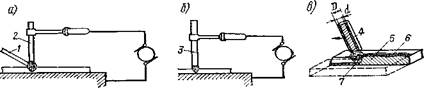 Сварка по способу Бенардоса. Сварка производится графитовым электродом 2 (рис. 4, а) с присадочным металлом от прутка 1 или без него; сварка этим способом имеет ограниченное применение. Ею пользуются для соединения с отбортовкой тонких стальных заготовок, где не требуется присадочный металл, для цветных металлов и чугуна, а также для наплавки порошковых твердых сплавов. Обычно применяют постоянный ток, причем для устойчивости дуги и лучшего прогрева стыка при сварке пользуются прямой полярностью: заготовку включают анодом (+), а электрод – катодом ( – ).