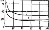 Напряжение дуги в зависимости от силы тока выражается кривыми, приведенными на рис. 5 , определяющими вольтамперную или статическую характеристику дуги (1 – для дуги 3 мм; 2 – для дуги 6 мм). Приведенные кривые показывают, что при токе свыше 50 А (наиболее часто применяемых при сварке) напряжение горения дуги почти не зависит от силы тока и определяется длиной дуги.