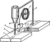 Сущность способа автоматической дуговой сварки под флюсом состоит в следующем. Сварочная головка 5 (рис. 7 ) подает в зону дуги электродную проволоку 3 из кассеты 6. Для питания дуги, образующейся между основным металлом 2 и электродной проволокой, обычно пользуются переменным током. По мере образования шва 9 головка 5, а с ней и дуга автоматически перемещаются вдольразделки 1. Вместе с головкой перемещается и бункер 4, из которого в разделку шва перед дугой засыпают гранулированный флюс. Таким образом, сварка протекает под слоем флюса, защищающего наплавляемый металл от воздуха. Часть флюса расплавляется от соприкосновения с дугой и при остывании образует корку 8, покрывающую шов. Сыпучий флюс, оставшийся поверх корки, отсасывается в бункер через сопло и шланг 7. Автоматическая сварка под слоем флюса в 5 - 10 раз производительнее ручной сварки.