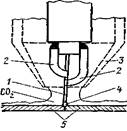 Вместе с тем сварка в среде защитных газов не заменяет названные способы сварки, а применяется в машино- и приборостроении там, где эти способы не дают необходимых результатов. Для сварки в струе углекислого газа применяют горелки-держатели (рис. 8 ). Дуга 4 горит между заготовкой 5 и электродной проволокой 1, которая автоматически подается с постоянной скоростью. Подвод тока к проволоке обеспечивается через контактные сапожки 2. Сварка выполняется на переменном или постоянном токе. Углекислый газ в зону сварки подается через сопло 3; к горелке он поступает от баллона. Образующийся при сварке оксид железа раскисляется марганцем и кремнием, которые в повышенном количестве содержатся в электродной проволоке. Сварку в углекислом газе широко применяют для углеродистой стали, заварки дефектов стальных отливок, наплавки и восстановления изношенных деталей.