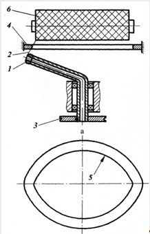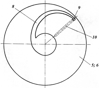 На рис. 1 изображена принципиальная схема механизма раскладки, в которой нитеводитель 1 в виде изогнутой трубки совершает вращательное движение. Наматываемая нить 2 движется по центральному отверстию этой трубки и раскладывается на поверхности тела намотки 6.