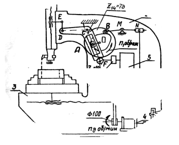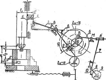 Рис. 2. Схема кривошипно-кулисного механизма движения резца и кулачкового механизма подачи стола долбежного станка.