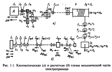 Массы элементов и жесткости элементарных связей в кинематической цепи привода различны. Определяющее влияние на движение системы оказывают наибольшие массы и наименьшие жесткости связей. Поэтому одной из первых задач проектирования и исследования электроприводов является составление упрощенных расчетных схем механической части, учитывающих возможность пренебрежения упругостью достаточно жестких механических связей и приближенного учета влияния малых движущихся масс. При этом следует учитывать, что в связи с наличием передач различные элементы системы движутся с разными скоростями, поэтому непосредственно сопоставлять их моменты инерции Ji , массы mj , жесткости связей ci и сj , деформации Dfi и DSj , перемещения fi и Sj и т. п. невозможно. Как следствие, для составления расчетных схем механической части электропривода необходимо приведение всех параметров элементов кинематической цепи к одной расчетной скорости. Обычно наибольшее удобство представляет приведение их к скорости двигателя, поэтому оно используется во всем последующем изложении. Однако следует иметь в виду возможность приведения к скорости любого элемента. В частности, при решении ряда задач оказывается полезным приведение к скорости