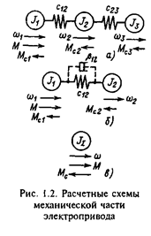 Исследования динамики электроприводов показывают, что неразветвленные расчетные механические схемы в большинстве практических случаев в результате выделения главных масс и жесткостей сводятся к трехмассовой (рис.1.2,а), двухмассовой (рис.1.2,б) расчетным схемам и к жесткому приведенному механическому звену (рис.1.2,в).