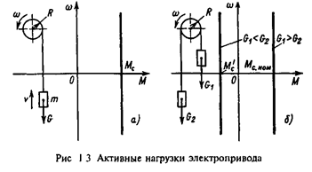 Активными силами и моментами называются силы и моменты, создаваемые внешними по отношению к двигателю источниками механической энергии независимо от движения электропривода, например потенциальной энергией перемещаемых по вертикали грузов, энергией ветра и т.п. На рис.1.3,a упрощенно показан подъемный механизм, нагрузкой которого является приведенный момент силы тяжести груза G: