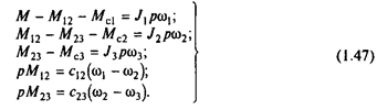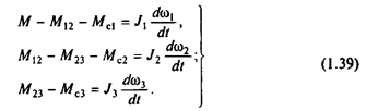 Параметрами обобщенной трехмассовой упругой механической системы (расчетной схемы на рис.1.2,а) являются суммарные приведенные моменты инерции масс J1 , J2 и J3 , образованные приведенными массами, связи между которыми приняты жесткими, и эквивалентные приведенные жесткости механических упругих связей между J1 и J2 -c12 и между J2 и J3 -c23 первая масса представляет собой ротор двигателя и жестко с ним связанные элементы; к этой массе приложены электромагнитный момент двигателя М и момент статической нагрузки Мс1 , который обычно является суммарным моментом потерь на валу двигателя и в жестко с ним связанных элементах.