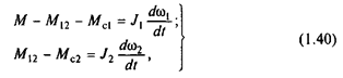 Динамические нагрузки механического оборудования в реальных установках в значительной мере возрастают из-за ударов, возникающих при выборе зазоров в передачах и сочленениях рабочего оборудования машин. С учетом кинематических зазоров расчетная двухмассовая схема механической части принимает вид, показанный на рис.1.28,а. В связи с наличием зазора Df3 зависимость М12 =f(f1 -f2 ) становится нелинейной и имеет вид, показанный на рис.1.28,б. Уравнения движения для этой системы на основании (1.40) запишутся при р=d/dt так: