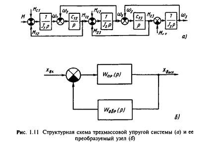 Электромагнитный момент двигателя является выходной величиной для электрической части системы (см. рис.В.2) и входной для механической, поэтому при рассмотрении процессов в системе он выделен из всех действующих на механическую часть внешних моментов. Все остальные силы и моменты определяют статическую нагрузку электропривода Mс . Во всех трех расчетных схемах (рис.1.2) в соответствии с (1.13) эта нагрузка неизменна, так как для двухмассовой системы Mc1 + Мс2 =Mс , а для трехмассовой Mс1 + Мс2 + Mс3 =Mс . Иными словами, при учете упругости суммарная нагрузка неизменна, но уточняется, к каким массам системы приложены отдельные составляющие нагрузки.