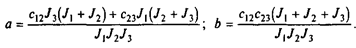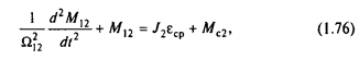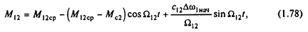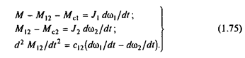 Для получения дифференциального уравнения системы, решенного относительно М12 , умножим первое уравнение на с12 /J2 а второе на с12 /J2 и произведем вычитание второго из первого. При этом с учетом третьего уравнения правая часть становится равной d2 M12 /dt2 , и после преобразований полученное уравнение можно записать так: