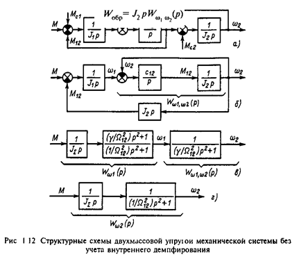 В обобщенной двухмассовой упругой системе (рис.1.2,б) суммарный приведенный момент инерции элементов, жестко связанных с двигателем, аналогично предыдущему обозначен J1 . Суммарный приведенный момент инерции элементов, жестко связанных с рабочим органом механизма, обозначен J2 . Безынерционная упругая связь между этими массами характеризуется приведенной эквивалентной жесткостью с12 . Суммарные моменты нагрузок на валу двигателя и механизма обозначены соответственно Mс1 и Mс2 .
