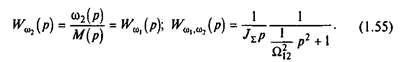 Проанализируем основные свойства механической части, воспользовавшись ее структурой, представленной на рис.1.12,в, и частотными характеристиками, изображенными на рис.1.13 При этом обратим внимание на различия во влиянии упругости на движение первой и второй масс. Движение первой массы при небольших частотах колебаний управляющего воздействия М в соответствии с (1.54) и рис.1.13,а определяется суммарным моментом инерции электропривода JS , причем механическая часть ведет себя как интегрирующее звено. В частности, при М=const скорость w1 изменяется по линейному закону, на который накладываются колебания, обусловленные упругой связью. Иными словами, интегрирующее звено в структуре на рис.1.12,б характеризует условия движения механической части в среднем.
