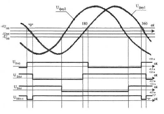 Превышение сигналом Uфву2 опорного напряжения Uon вызывает срабатывание компаратора DA1. При этом на его выходе появится сигнал Udai=-0,5 в ("0"). Если ифСУ 2 < Uon то выходное напряжение Udai= + 3,3 в ("1"). Состояние компаратора DA3 меняется согласно полярности сигнала Uфву 1.