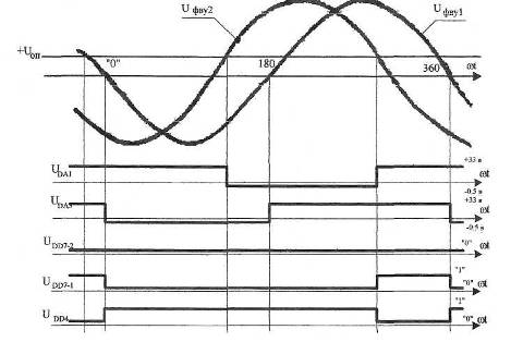 Состояние компаратора DA1 изменяется соответственно изменению сигнала l^By 2 . Согласно диаграмме на рисЛ, в зоне исходного положения выходной сигнал ИИП Ubd3-i= "0"- Транзистор VT1 открывается, замыкая цепь светодиода HL1, Тем самым осуществляется сигнализация исходного положения барабана. В зоне 1805 ("ложный нуль") выходной сигнал Udd3-i= «1>>, так как на вход схемы DD3-1 подан сигнал запрета UDA i= «0» от компаратора DA1. Диаграмма показывает изменение сигнала UD d3-iза один оборот сельсина.